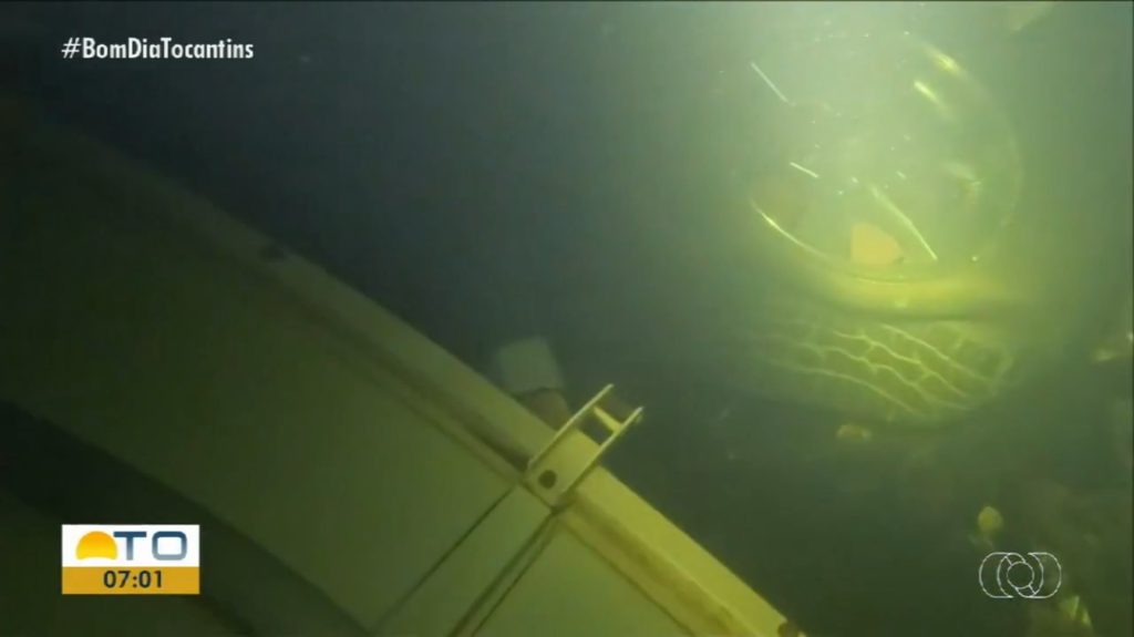 As águas do rio Tocantins nesta profundidade são escuras, quase não chega luz solar. Por isso, os mergulhadores trabalham apenas com a luz das lanternas.