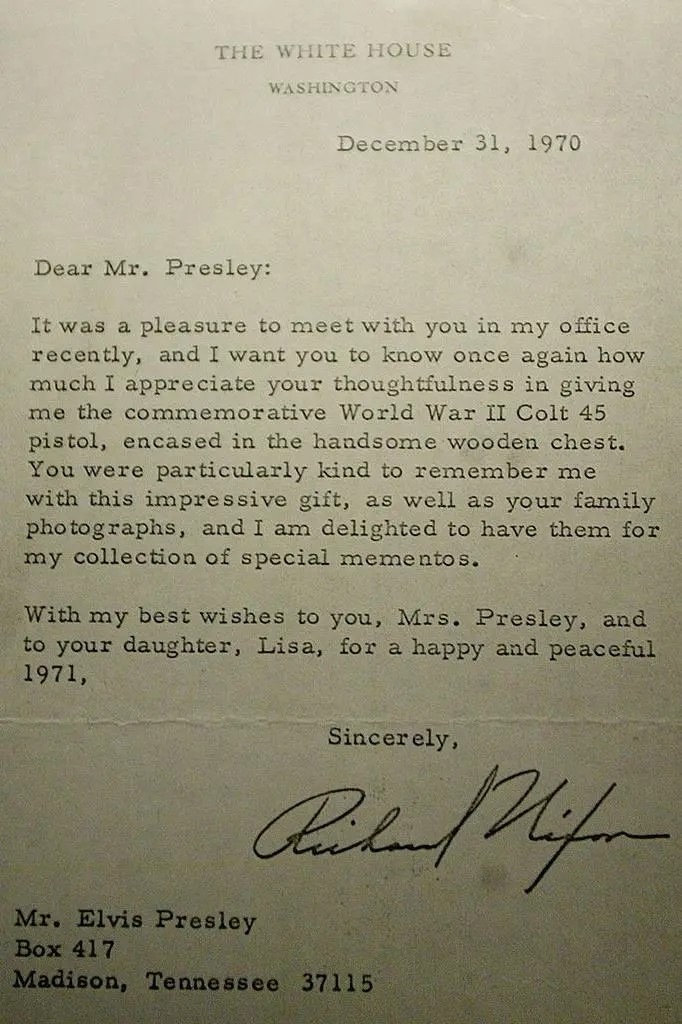 A carta de Nixon agradece a Presley pelo presente e lhe deseja o melhor para ele e sua família no ano seguinte.